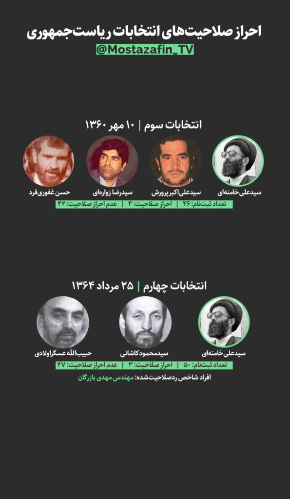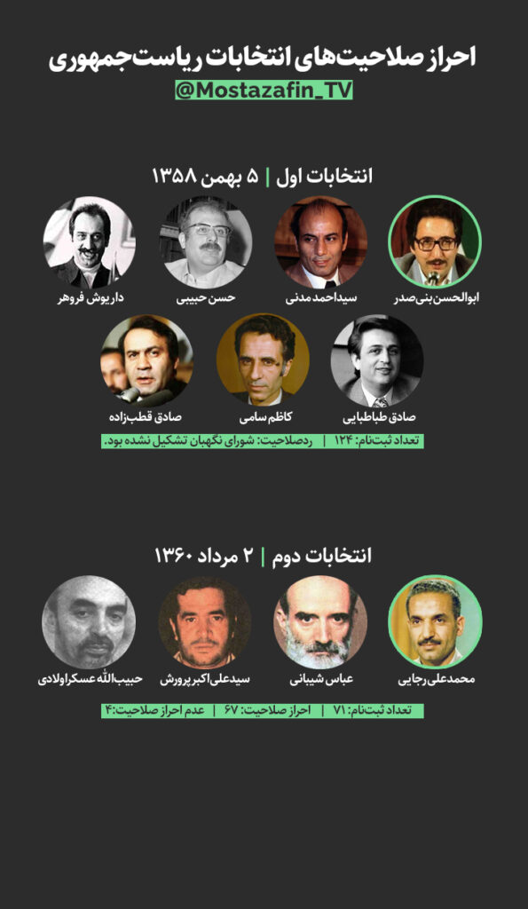 اولین انتخابات ریاست جمهوری، بهمن ۵۸ بود. از آنجا که در آن زمان، هنوز ۶ عضو حقوقدان شورای نگهبان مشخص نشده بودند (چون مجلس هنوز تشکیل نشده بود)، تأیید صلاحیتهای ریاست جمهوری به جای شورای نگهبان به رهبر (امام خمینی) واگذار شده بود. امام البته پیش از این اعلام کرده بود در انتخابات دخالت نمیکند.